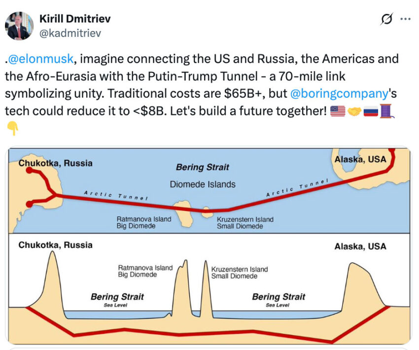 Apparently out of the blue, a Russian investment envoy named Kirill Dmitriev suggested on X on Thursday that Elon Musk’s tunneling company build a link between the rival countries, with partial funding from Russia’s sovereign wealth fund. Dmitriev wove in some flattery, saying the “70-mile link symbolizing unity” could be named the “Putin-Trump Tunnel.” “Let’s build a future together!” Dmitriev wrote, tagging Musk’s personal account and his Boring Company.
