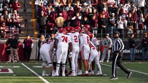 The South Dakota offense huddles in the FCS quarterfinals against Montana on Saturday, Dec. 13 in Missoula, Montana.