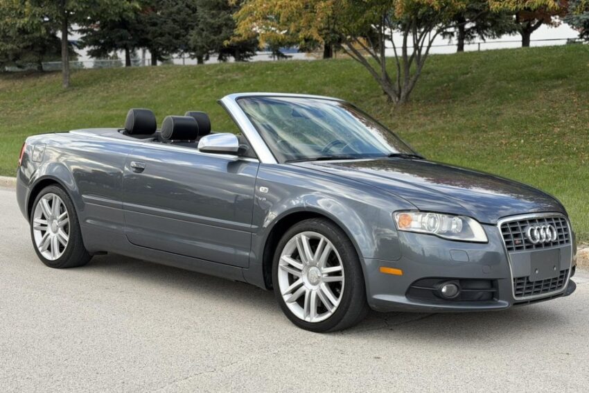 This 2007 Audi S4 cabriolet is powered by a 4. 2-liter V8 linked with a six-speed manual transaxle, a Torsen torque-sensing center differential, and a Quattro all-wheel-drive system, and it is finished in Quartz Gray Metallic over Ebony leather. Equipment includes a power-retractable black convertible soft top, xenon headlights, a sport suspension, 18″ split seven-spoke alloy wheels, power-adjustable front seats, Audi Navigation Plus infotainment, a Bose sound system, and dual-zone automatic climate control. This B7 S4 has 114k miles following history with three registered owners is now offered in Illinois by the selling dealer at no reserve with a Maryland title.